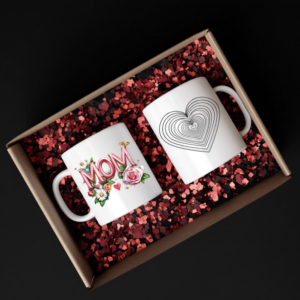 Mugs in the box, Mothers Day theme with red confetti, mockup No94