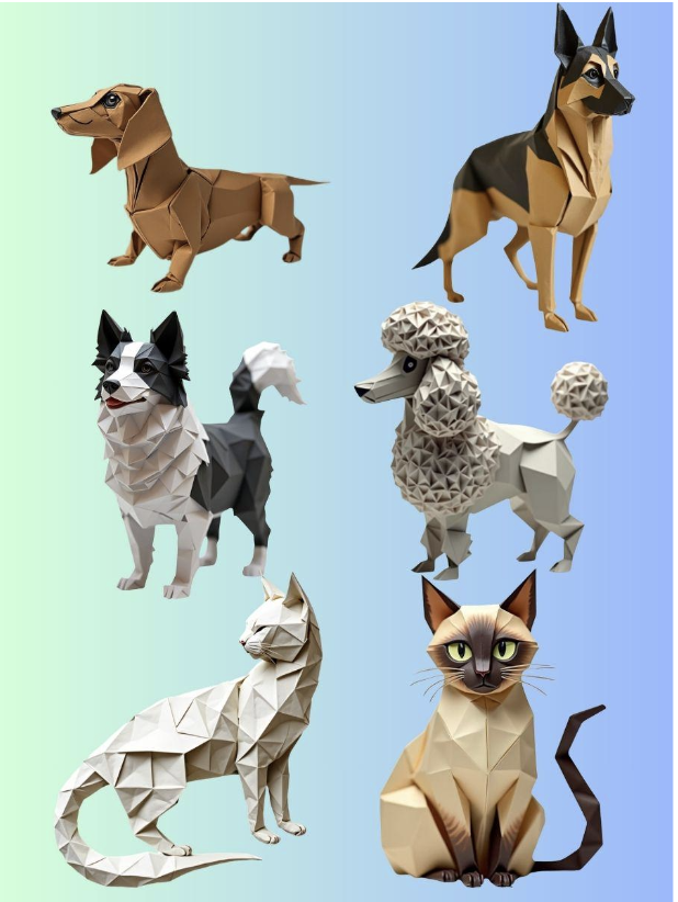 Some of our Pets as Origami, Friendly Animals’ Images, Cartoon Figures, Paper Dogs and Cats on Pics, Half Dozen PNGs No74